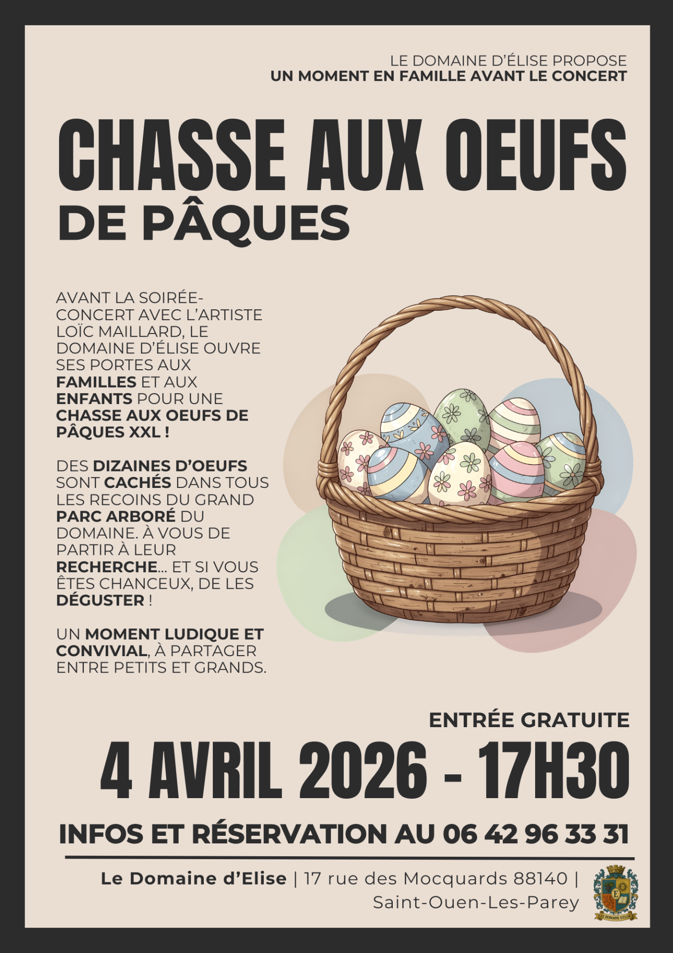 Description : Avant la soirée concert avec l'artiste Loïc Maillard, le Domaine d'Elise ouvre ses portes aux familles et aux enfants pour une chasse aux oeufs de Pâques XXL ! Des dizaines d'oeufs sont cachés dans tous les recoins du grand parc arboré du Domaine. A vous de partir à leur recherche... Et si vous êtes chanceux, de les déguster ! Un moment ludique et convivial, à partager entre petits et grands.